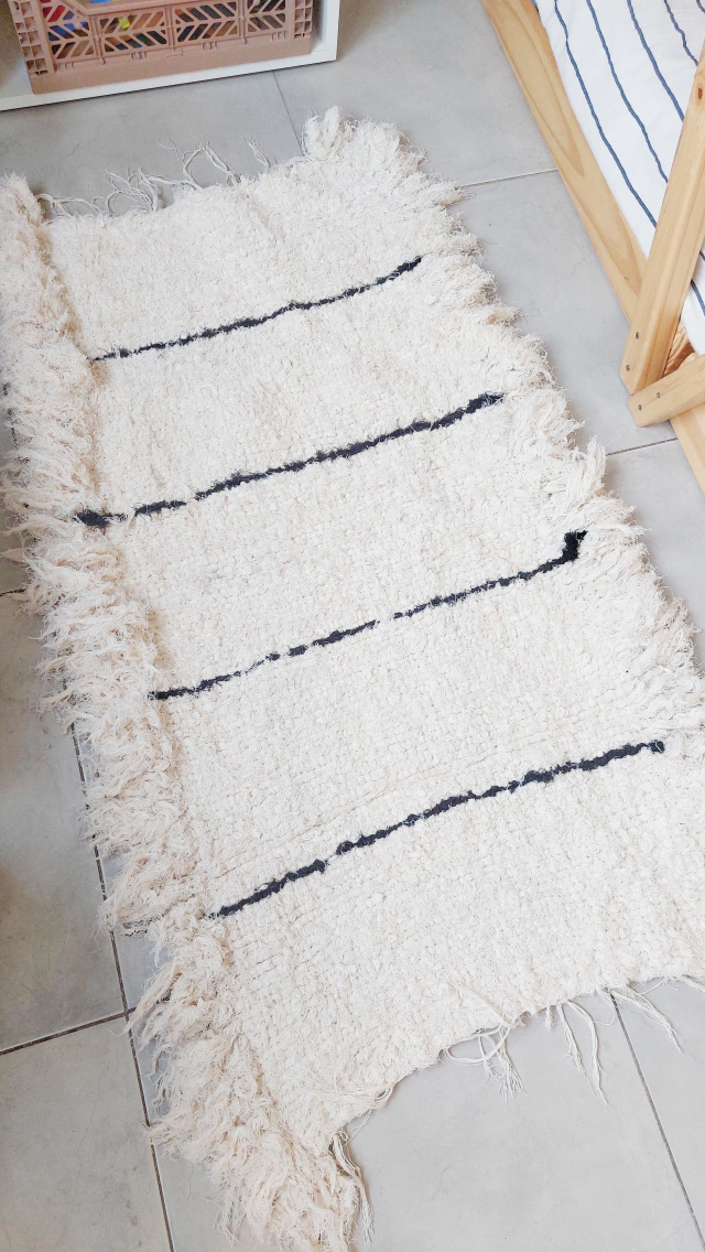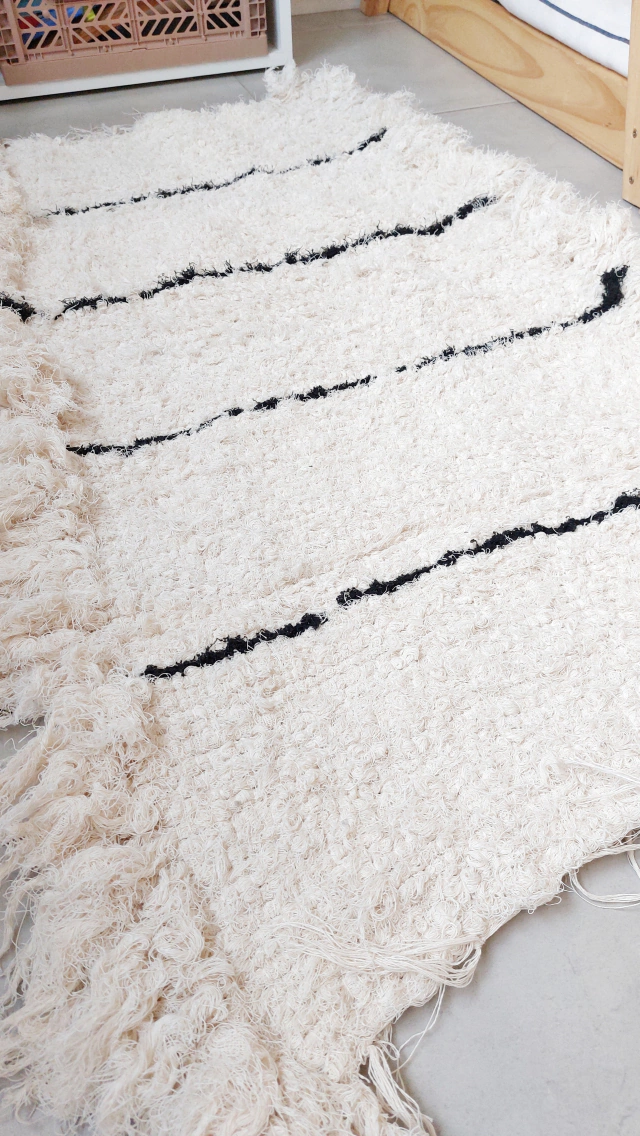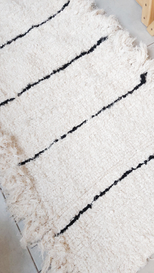 Alfombra de telar, 100% algodón con flecos laterales y rayas negras.